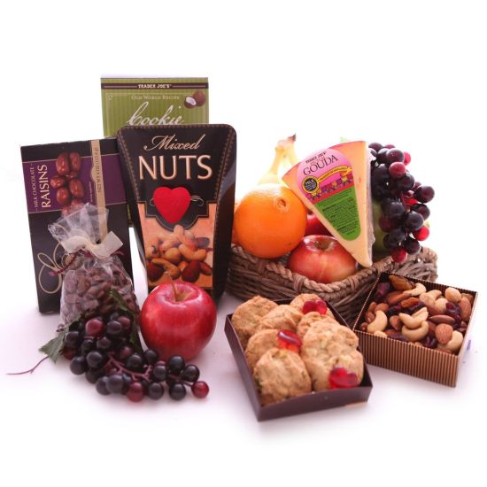 Valentine's Day is full of romantic adventures, from dinner to shows and late walks at night. Make sure you end it just as happily as you began with a sweet hamper that will win their heart. Your recipient will receive a box of delicious Milk Chocolate Covered Raisins, nostalgic gourmet Cookies, rich Gouda Cheese, a box of mixed Nuts and an assortment of fresh Fruits.